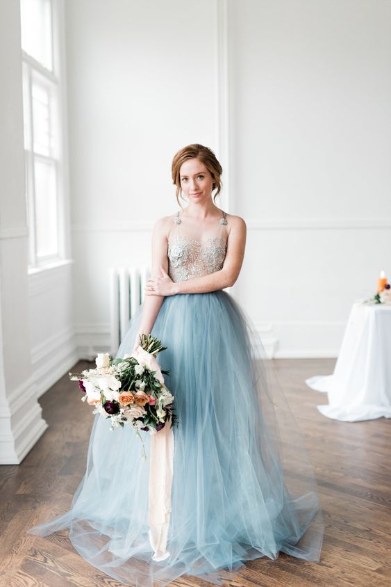 Ball Gown Blue Tulle Lace Beach Boho Wedding Dresses Bridal Gowns