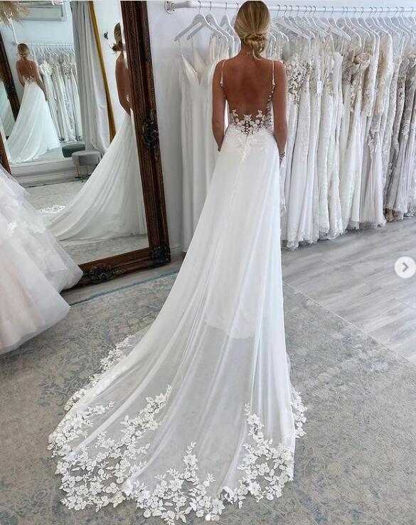 Exquisite Floral Appliques Wedding Dress, Deep V-neck Wedding Gown, Backless Bridal Dress