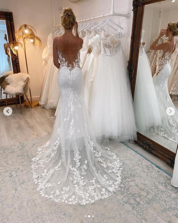 Mermaid Floral Appliques Wedding Dress, Illusion Straps Tulle Wedding Gown, Backless Bridal Dress