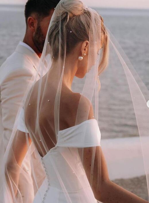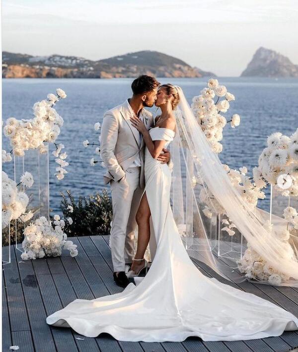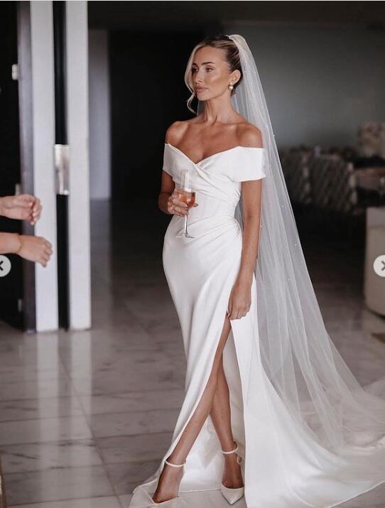 Simple Sheath Lace Wedding Dress, Off the Shoulder Wedding Gown, Satin Bridal Dress