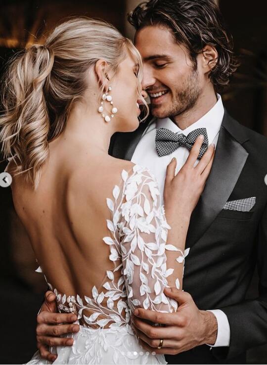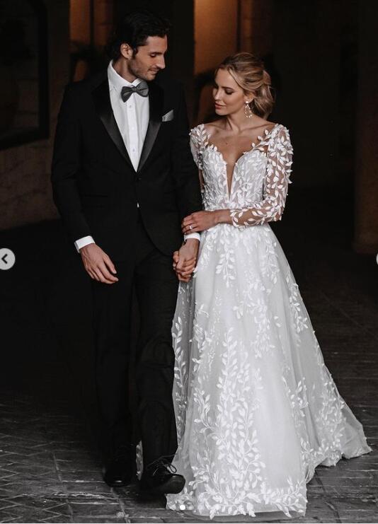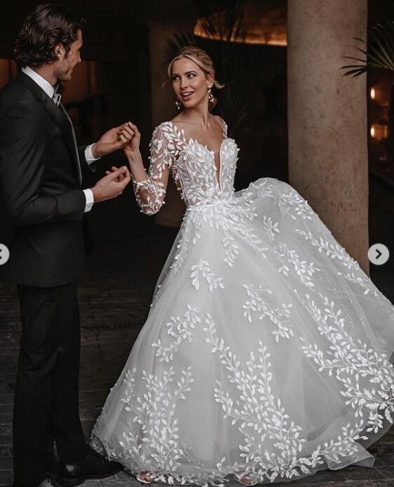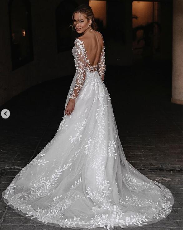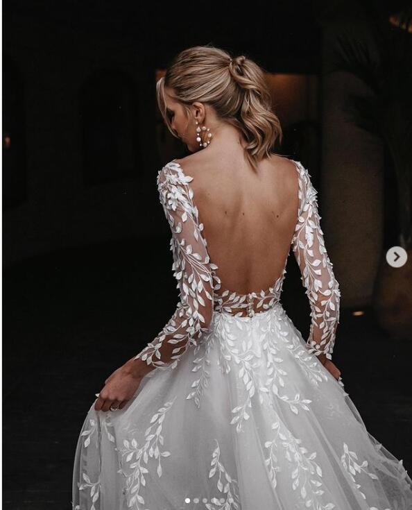 Floral Lace Wedding Dress, Long Sleeves Wedding Gown, Backless Tulle Bridal Dress
