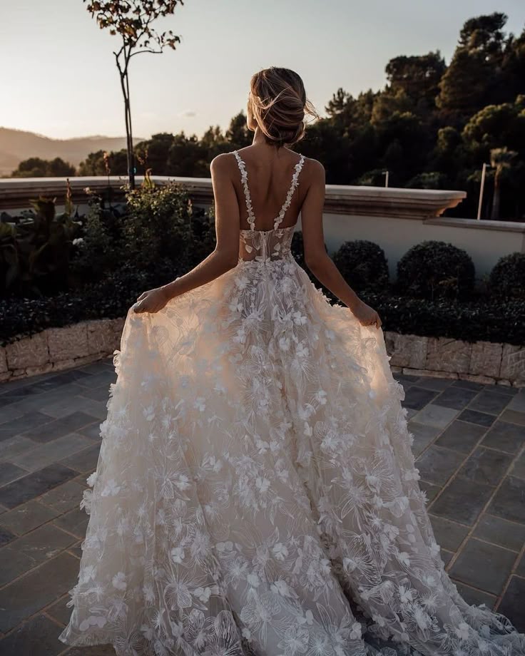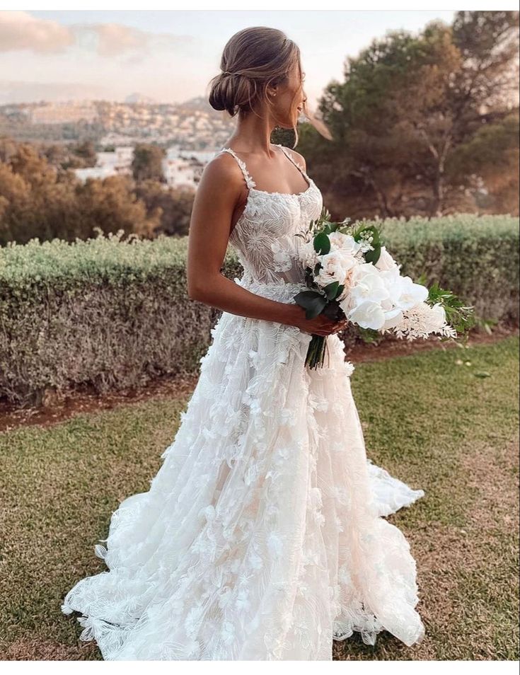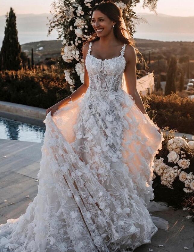 Luxury Floral Wedding Dress, Lace Flowers Tulle Wedding Dress Bridal Gown