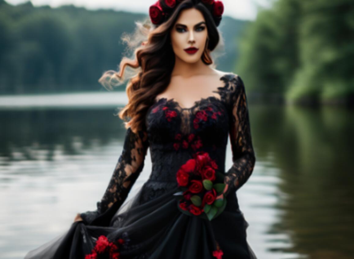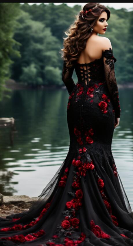 Gothic Mermaid Wedding Dress, Black and Red Appliques Tulle Bridal Dress Bridal Gown