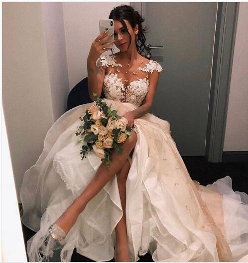 Sexy V-neck Wedding Dress, Sheer Bodice Wedding Dress, High Split Long Bridal Dress Wedding Gown