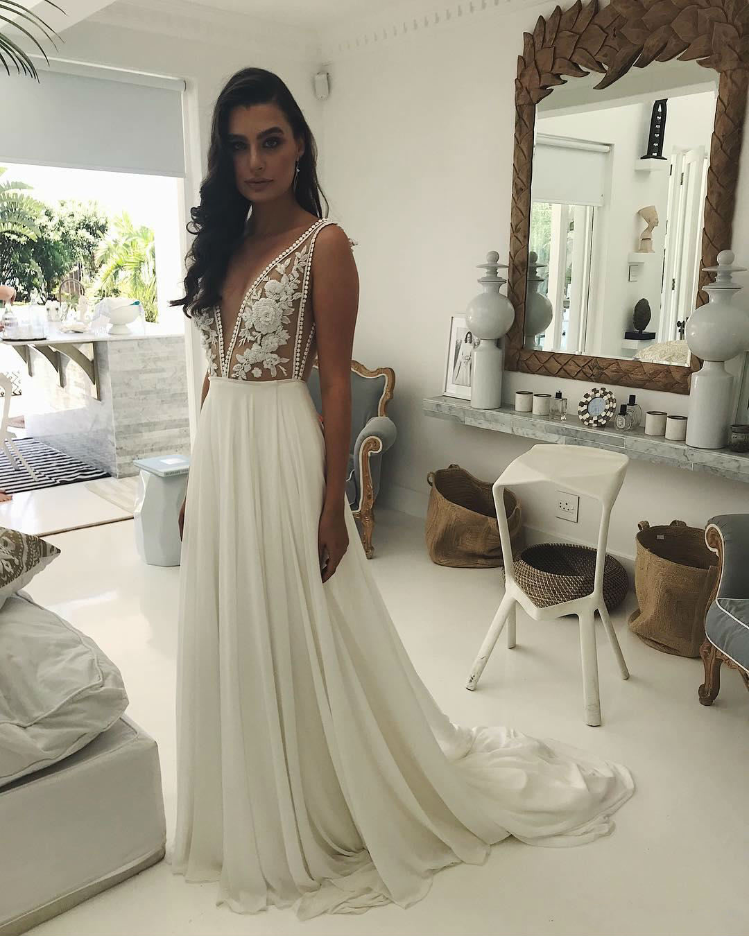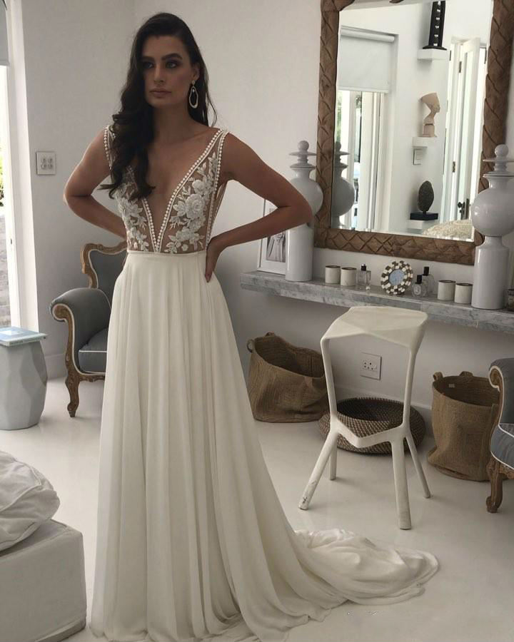 Bohemian A-line Wedding Dress, Boho Simple V-neck Wedding Dress, Backless Wedding Gown Bridal Dress