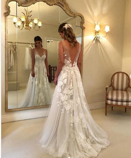 Modest Wedding Dress, V-neck Wedding Dress, Tulle with Appliques Wedding Dress