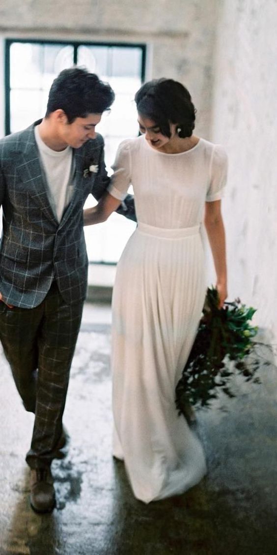 Simple Modest Wedding Dress, Short Sleeves Wedding Dress, Long Bridal Dress