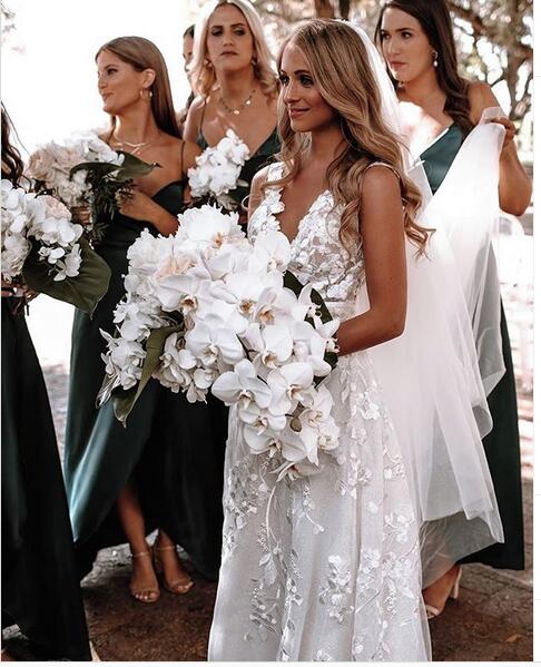Lace Wedding Dress, Deep V Neck Wedding Dress, Handmade Flowers Bridal Dress