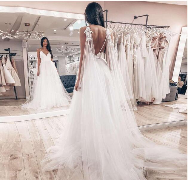 Romantic Tulle Appliques Bridal Gowns Backless Robes De Mariee Sexy Spaghetti Straps A Line Wedding Dresses with Long Wrap