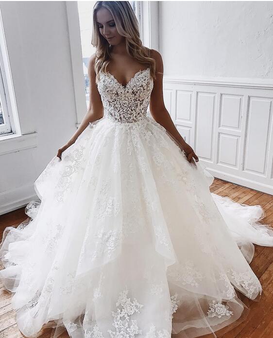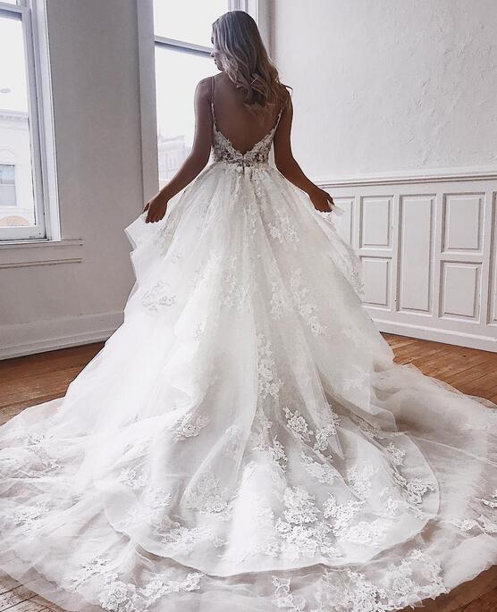 Vintage Women A-Line Long Lace Wedding Dresses with Straps Tulle Custom Made Ivory Sweep Train V-Neck Zipper Back Bridal Gowns