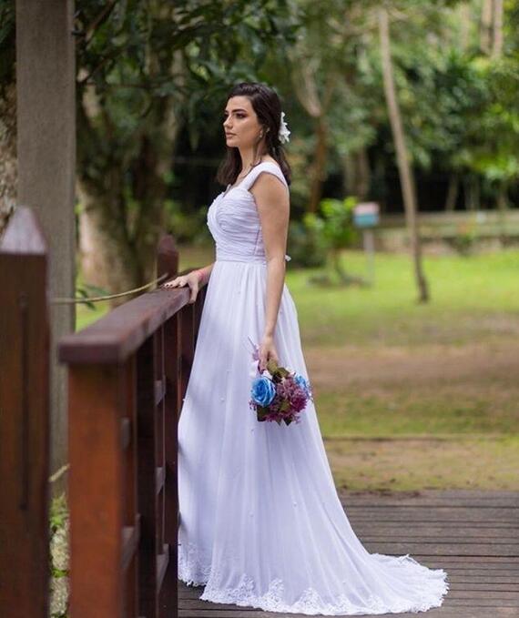 White Chiffon Wedding Dresses Pleats Tank A-Line Elegant Wedding Gowns Pleats Pearls Lace Appliques Bride Wedding Wear Beach