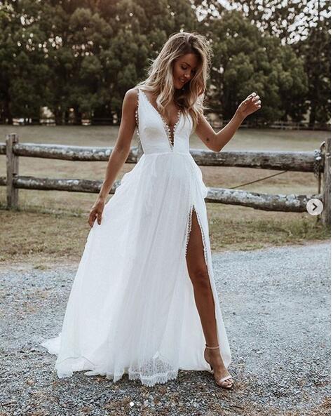 Summer Beach Boho Wedding Dresses V Neck Side Slit Bridal Gowns