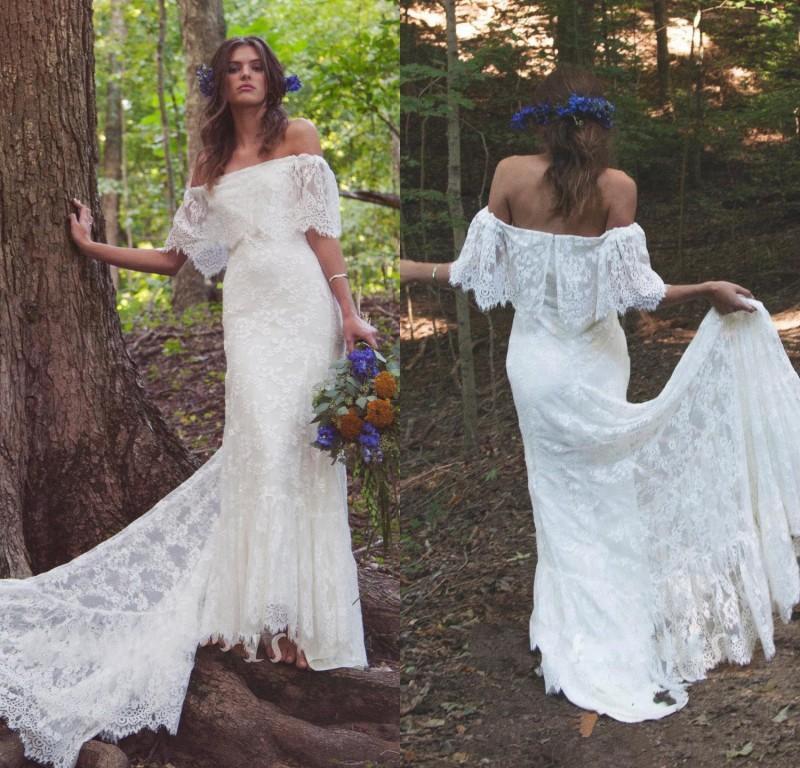 Vintage Mermaid Boho Wedding Dresses 2020 Off Shoulder Lace Long Train Romantic Beach Holiday Country Bride Wedding Gown