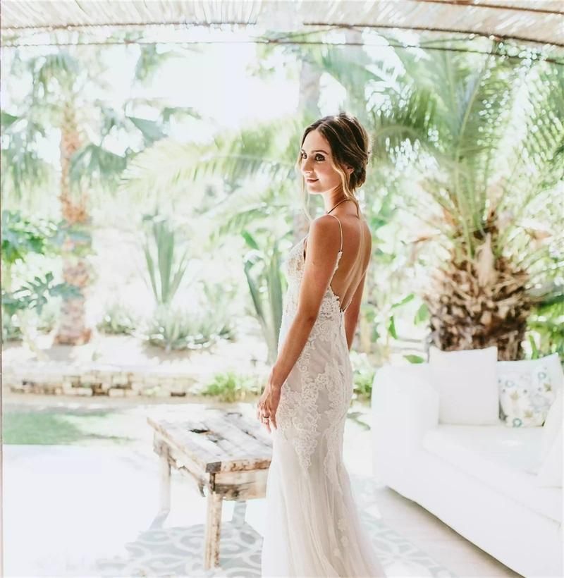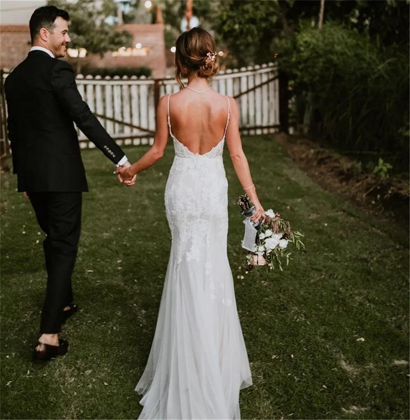 Sexy Backless Spaghetti Strap Bohemian Wedding Dresses Appliqued Lace Cheap Bridal Gown Beach Custom Made Sweep Train Bridal Dress