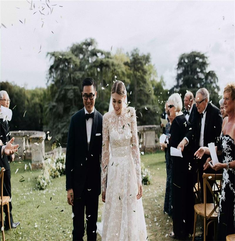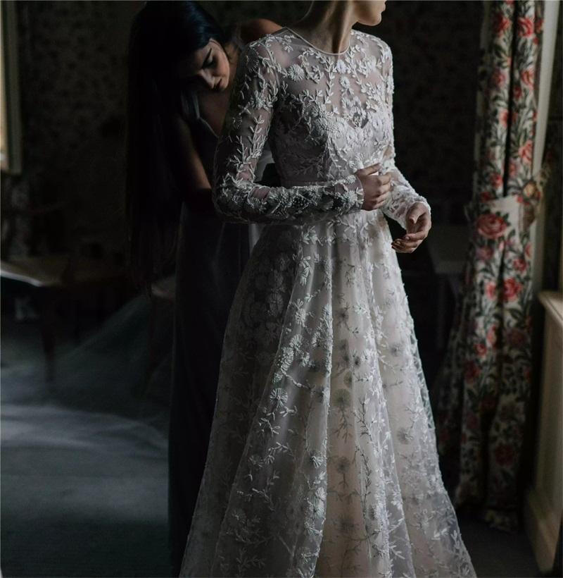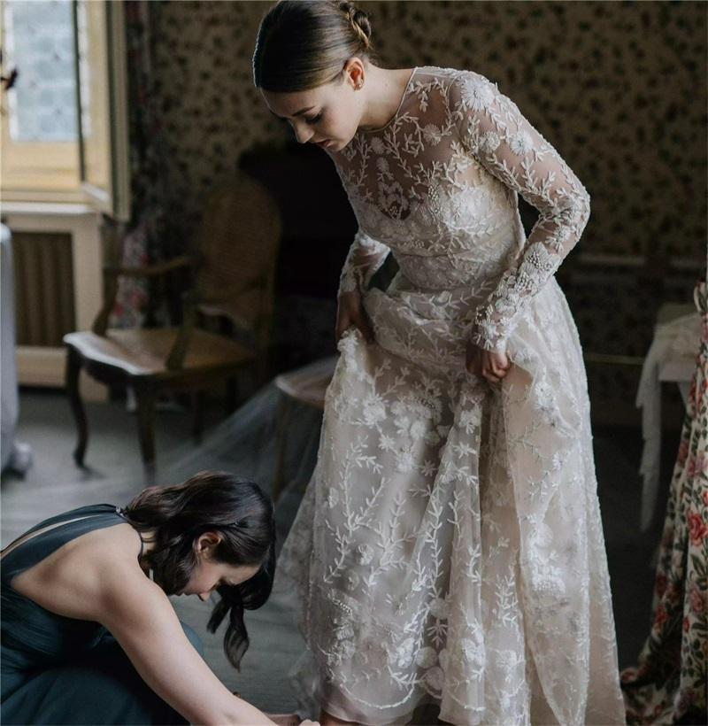 Elegant A Line Wedding Dresses Appliqued Lace Jewel Long Sleeves Illusion Wedding Gown Beach Custom Made Vestidos De Novia