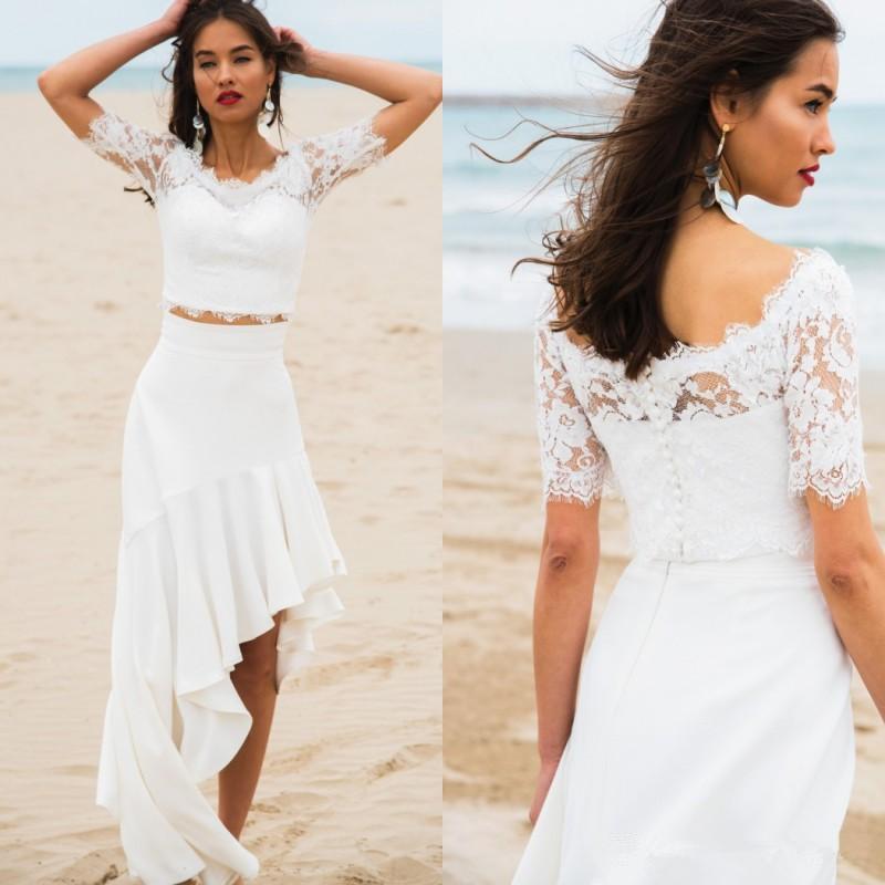 Summer Beach Mermaid Wedding Dresses Two Pieces Lace Top Buttons Back Vestidos De Festa High Low A Line Short Bridal Gowns