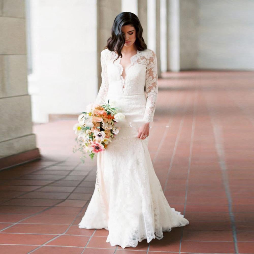 Elegant Mermaid Wedding Dresses Lace Applique Deep V Neck Long Sleeves Formal Bridal Gowns Sweep Train Appliques Wedding Dress