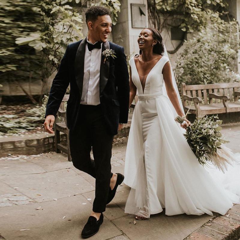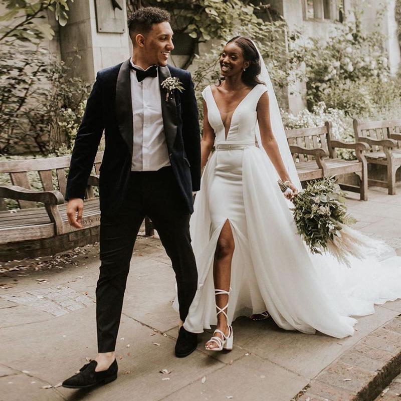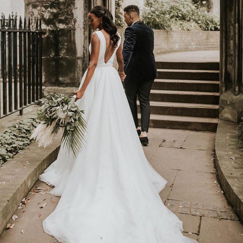 V Neck Front Split Satin Wedding Dresses With Detachable Train Open Back Custom Made Satin Tulle Overskirt Bridal Dress