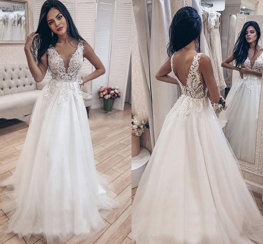 Vestidos De Novia Deep V Neck Appliqued Lace Sweep Train Bridal Gown Sexy Backless A Line Tulle Wedding Dresses