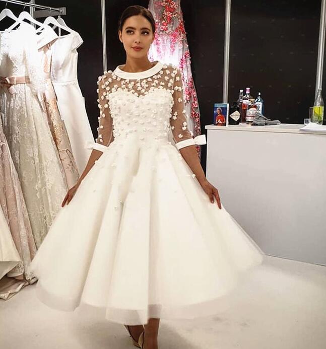 Vintage Tea Length Short Wedding Dresses Transparent Half Sleeve Sexy Sheer Neck 3D Little Flowers Bridal Gowns vestido de noiva