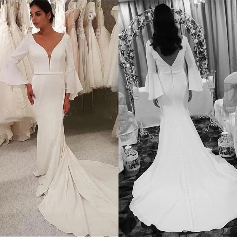 Vintage Satin Mermaid Wedding Dresses V-Neck Long Sleeves Backless Garden Country Arabic Bridal Gowns vestidos de novia