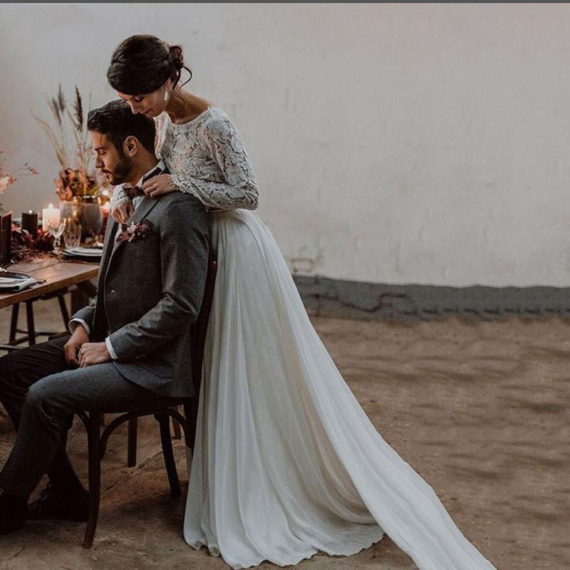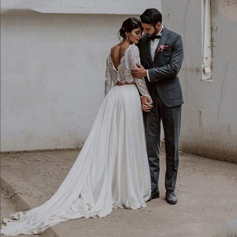 Two Pieces Beach Wedding Dresses Bohemian Country Lace 2020 Long Sleeve Top Bridal Gown Sexy Split Chiffon A Line Robes De Mariee