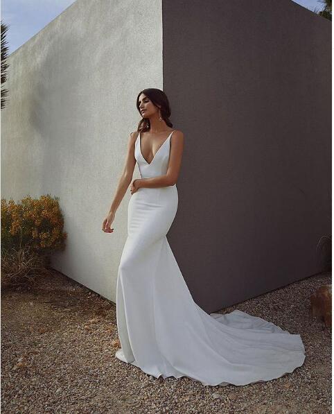 Sexy Wedding Dress, Mermaid Wedding Dress, Deep V-neck Satin Wedding Gown Bridal Dress