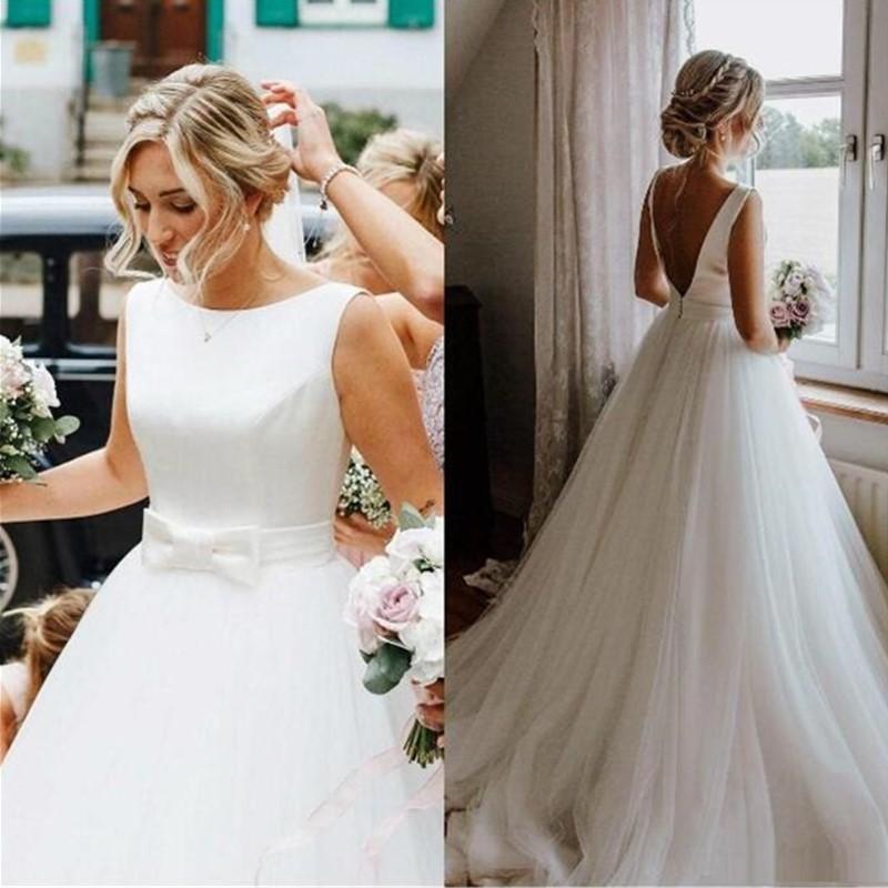 Custom Jewel Neck Wedding Dresses with Bow Sash Sweep Train Tulle A Line Wedding Bridal Gowns