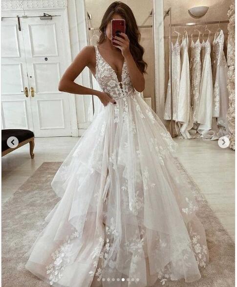 A-line Wedding Dress Deep V-neck Appliques Bridal Gowns Wedding Gown