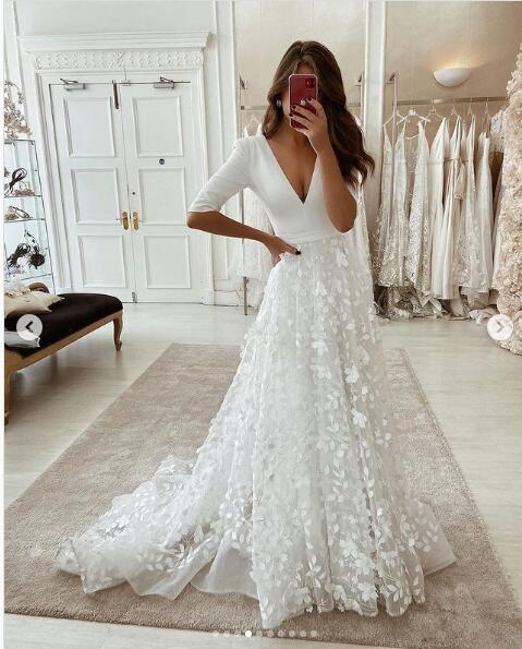 Sexy V-neck Wedding Dress Short Sleeves Tulle with Appliques Side Split Bridal Gowns Wedding Gown
