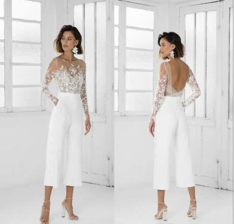 Vintage White Women Jumpsuit Wedding Dresses With Long Sleeves Tea Length Custom Made Beach Garden Wedding Bridal Gown