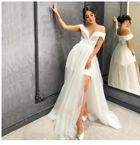 Side Split Off the Shoulder Bridal Dresses A Line Wedding Gowns Lace Appliques Ruched Boho Vestido De Noiva with Overskirtves Square Collar