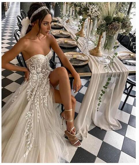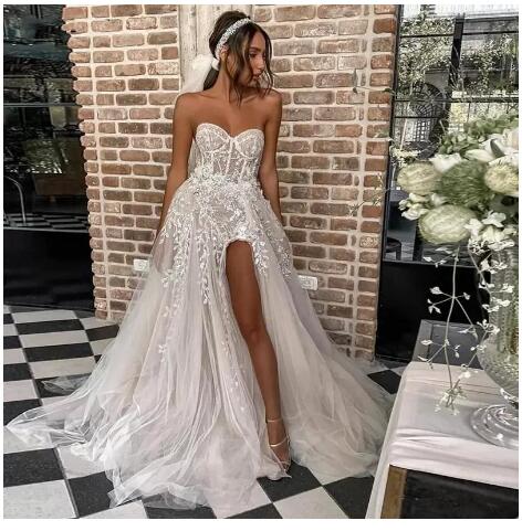 Strapless Split Lace A Line Wedding Dresses Sweep Train Lace-up Back Tulle Plus Size Beach Bridal Gowns
