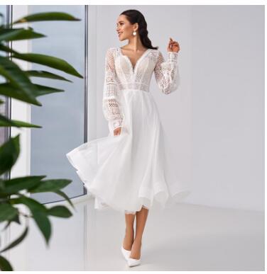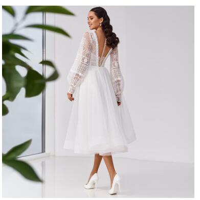 Tea Length beach Wedding Dresses Lantern Long Sleeve Lace Illusion Button Back Boho country Short Bridal Gown For Womening Dresses