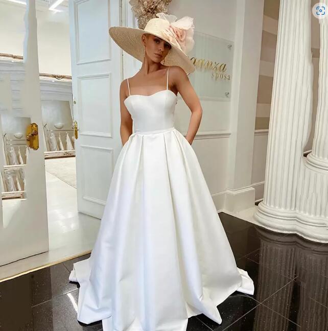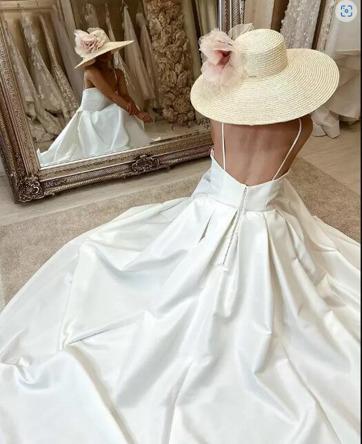 Spaghetti Straps Garden Wedding Dresses Satin A Line Bridal Gowns with Pocket Simple Backless Long Train Mariage Wear