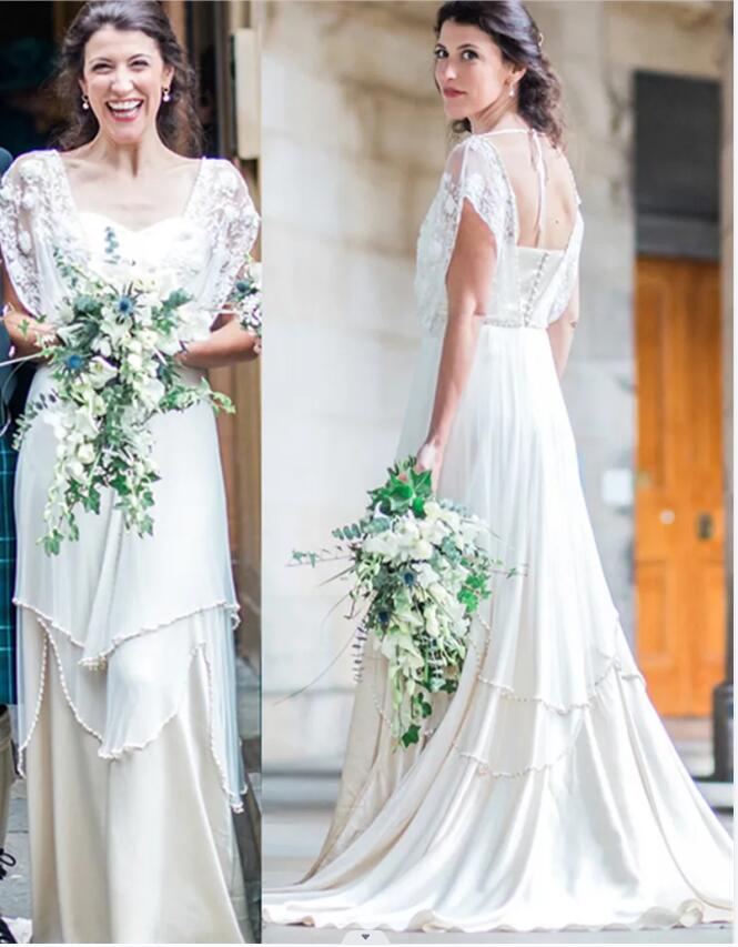 Hippie Style A Line Wedding Dresses Beaded Lace Appliqued Long Country Bridal Gowns Sweetheart Neck Cap Sleeve Designer Bride Formal Reception Wear