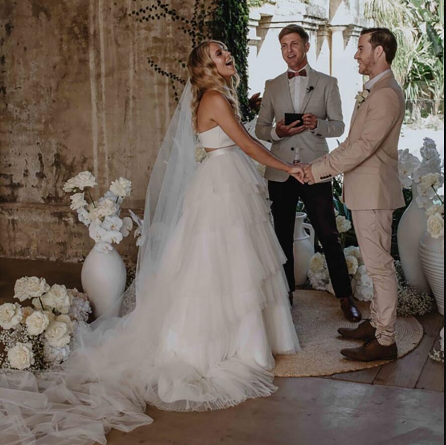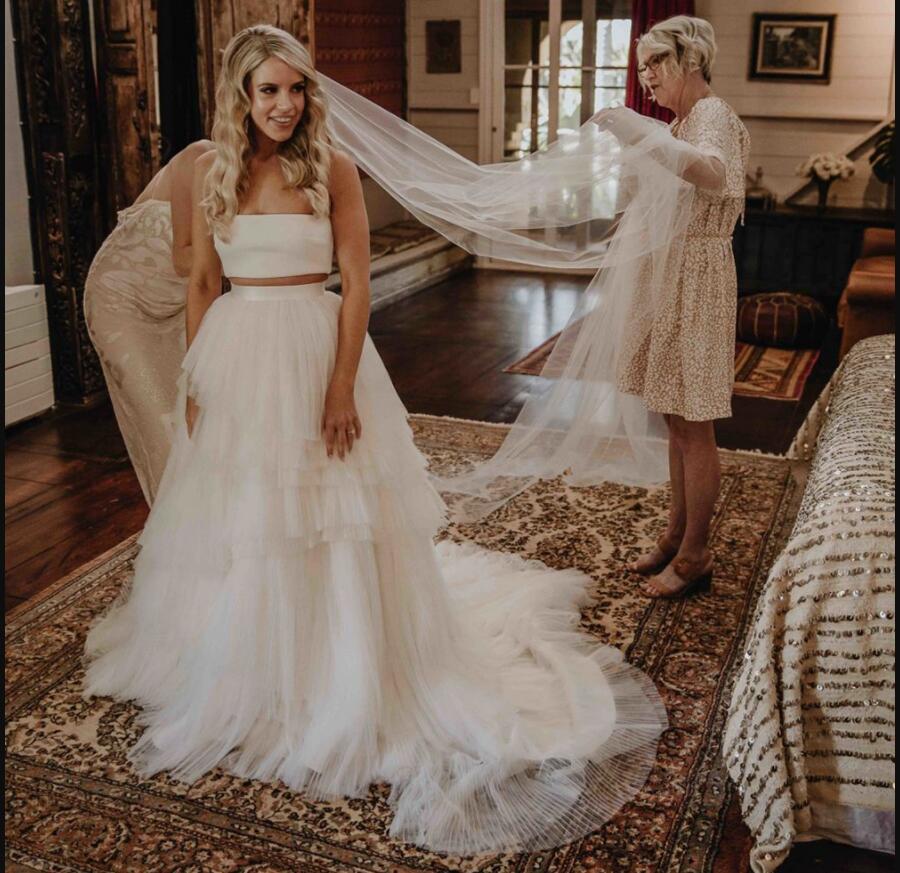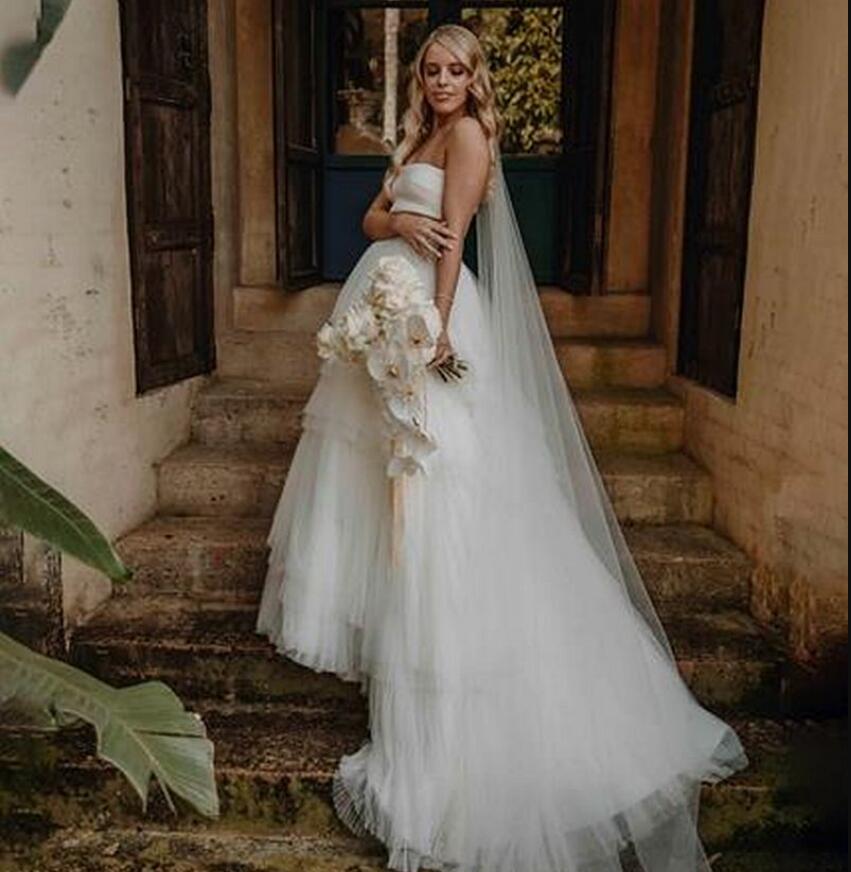 Two Pieces Boho A Line Wedding Dresses Pleats Tiered Skirt Strapless Sleeveless Long Beach Ivory Tulle Bridal Gowns Court Train Back Buttons