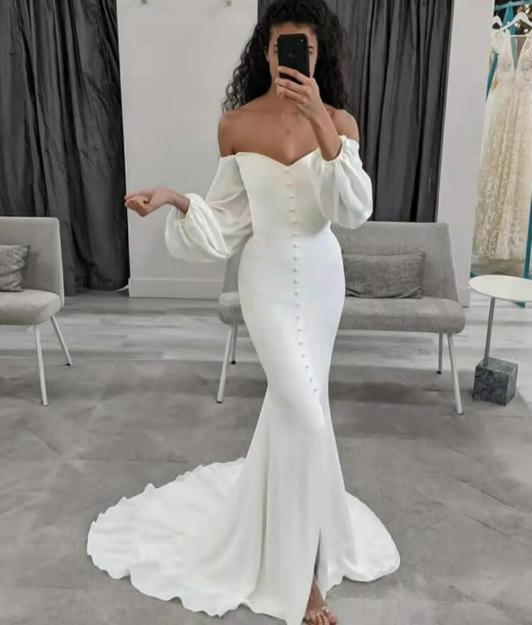 Elegant Long V-Neck Mermaid Wedding Dresses with Sleeves Custom Ivory Satin Floor Length Button Back Bridal Gowns for Women