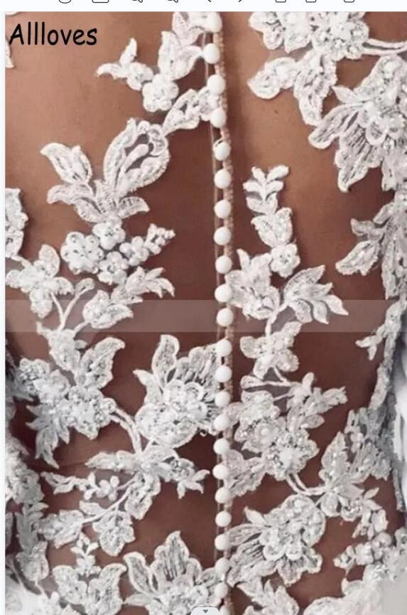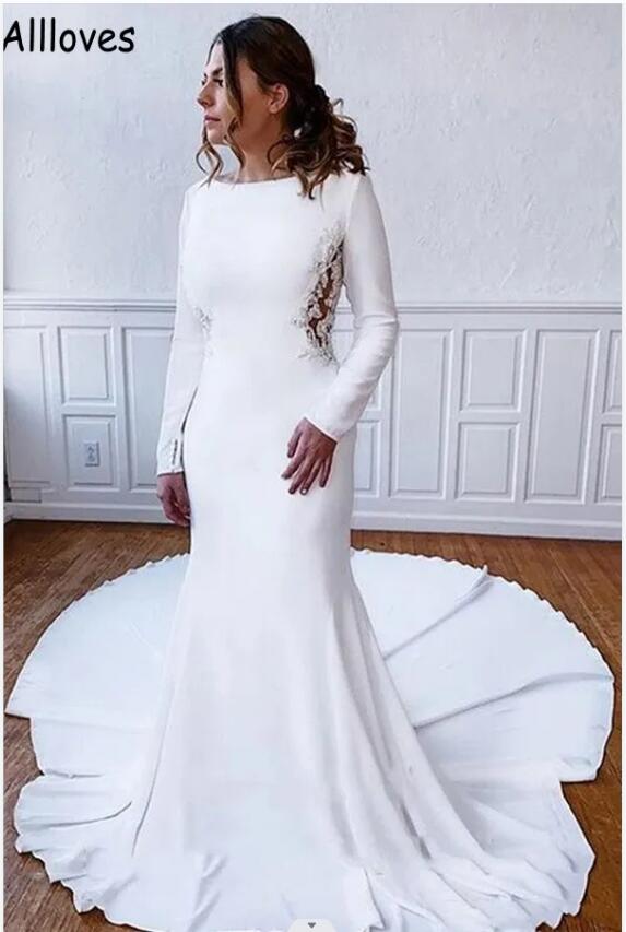 Modern White Satin Mermaid Wedding Dresses With Long Sleeves Lace Appliqued See Through Buttons Back Bridal Gowns