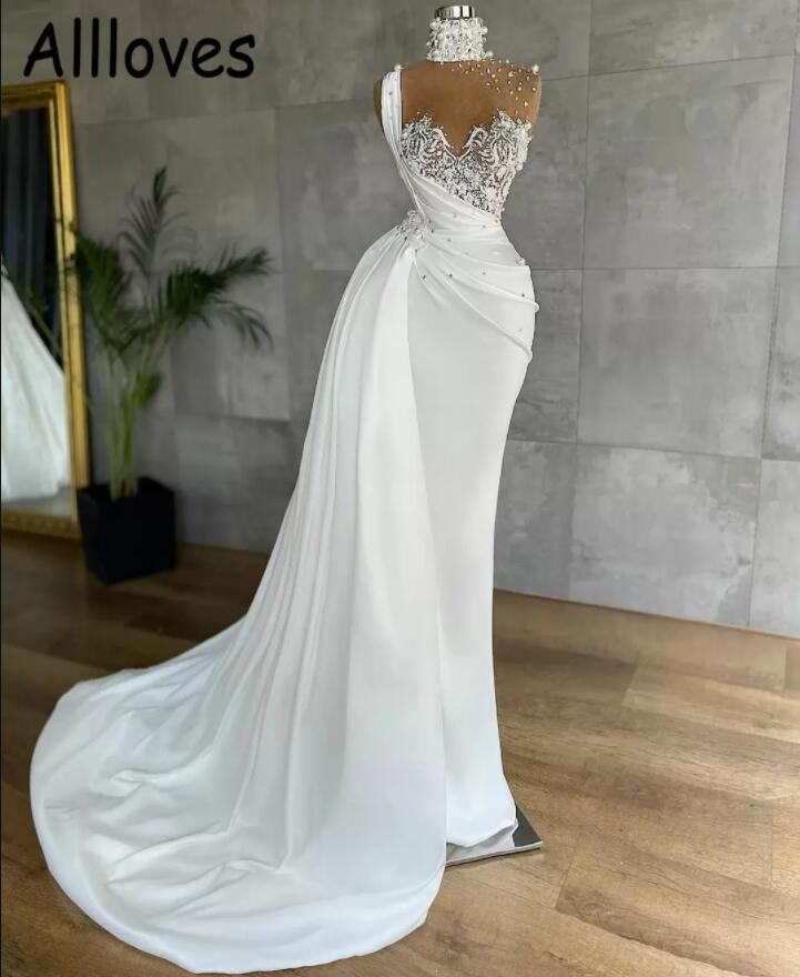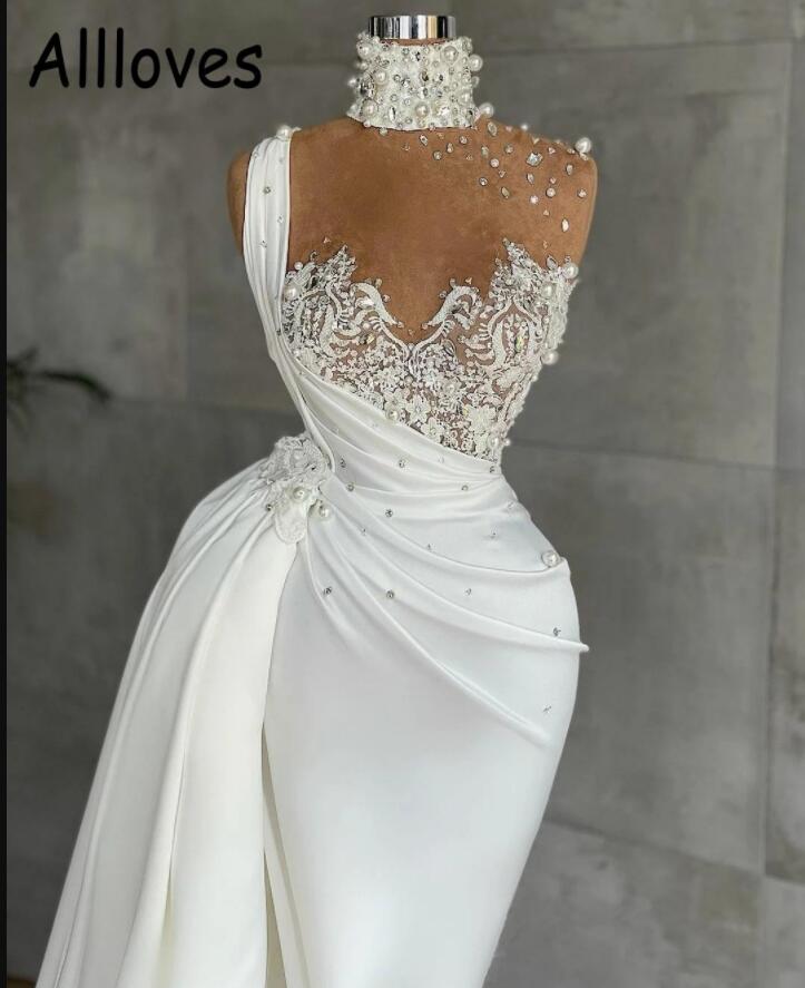 Saudi Arabia Dubai Mermaid Wedding Dresses For Bride Gorgeous Pearls Lace Applique Beaded Bridal Gowns High Neck Modern Robes de Mariee
