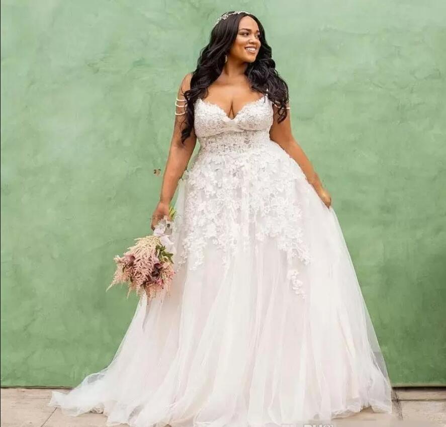 Plus Size A Line Wedding Dresses Sexy Spaghetti Straps Lace Applique Tulle Sweep Train Garden Country Wedding Gown vestido de novia