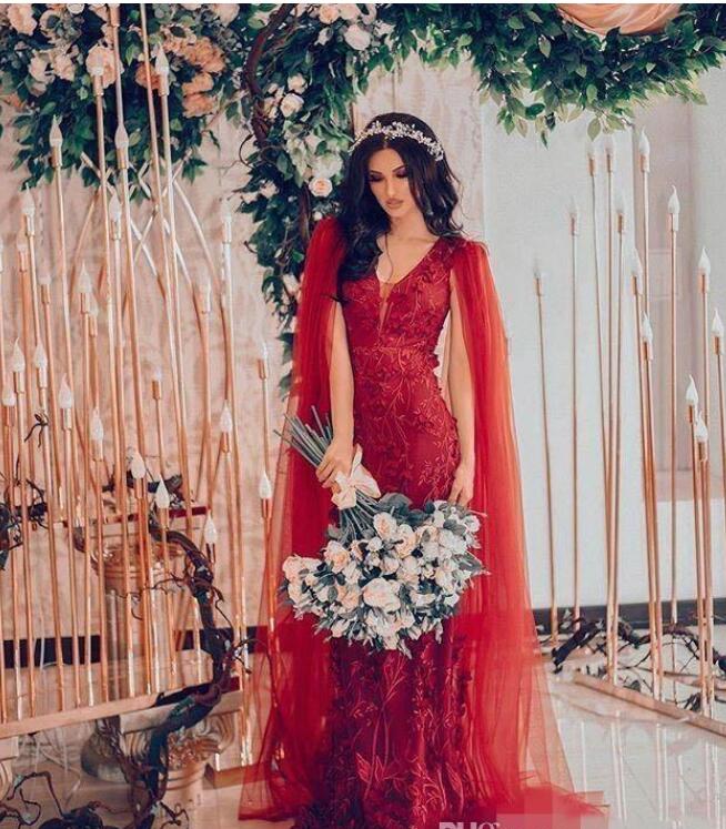 Gothic Red Mermaid Wedding Dresses V Neck Tulle Lace Applique Sweep Train Custom Made Plus Size Beach Wedding Bridal Gown Vestido de novia