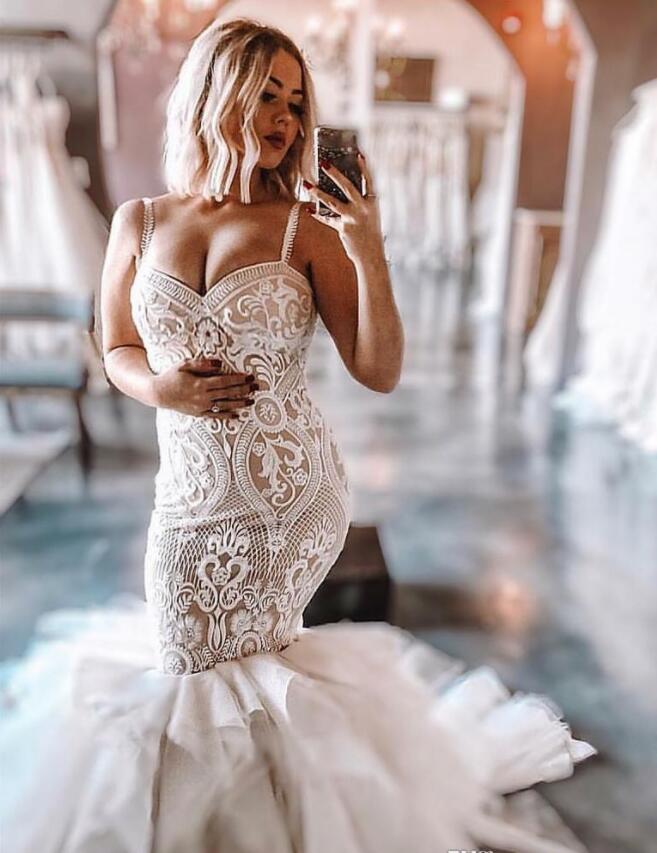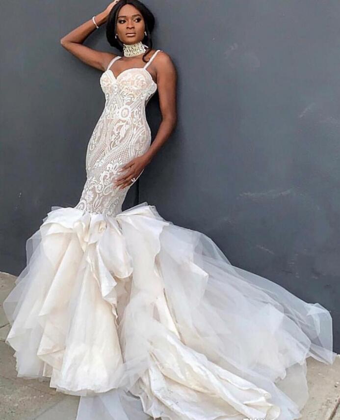 Plus Size Mermaid Wedding Dresses Sexy Spaghetti Lace Applique Tiered Skirts robe de mariée Gorgeous Beach Wedding Dress Custom Made