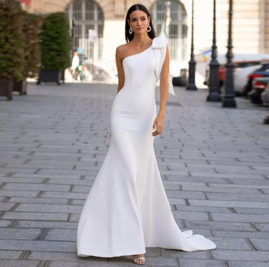 Vestidos Satin Mermaid Wedding Dresses Sexy One Shoulder Sleeveless Bridal Gown Beach Wedding Party Gown with Bow