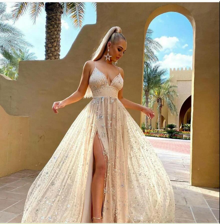Beach Bling Bling Champagne Wedding Dresses Spaghetti Straps A Line Bridal Gowns