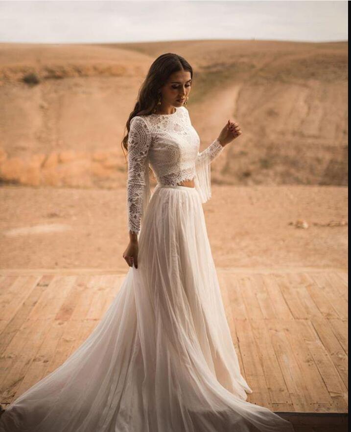 Bohemian New Arrival Long Sleeve Two Pieces Wedding Dresses Lace Tulle Appliques Jewel Neck Bridal Gowns Button Tassel Wedding Gowns