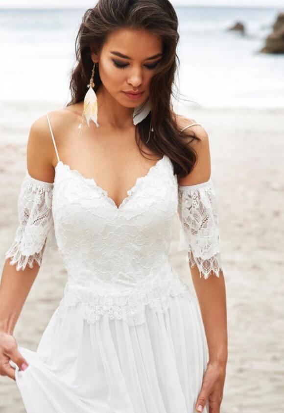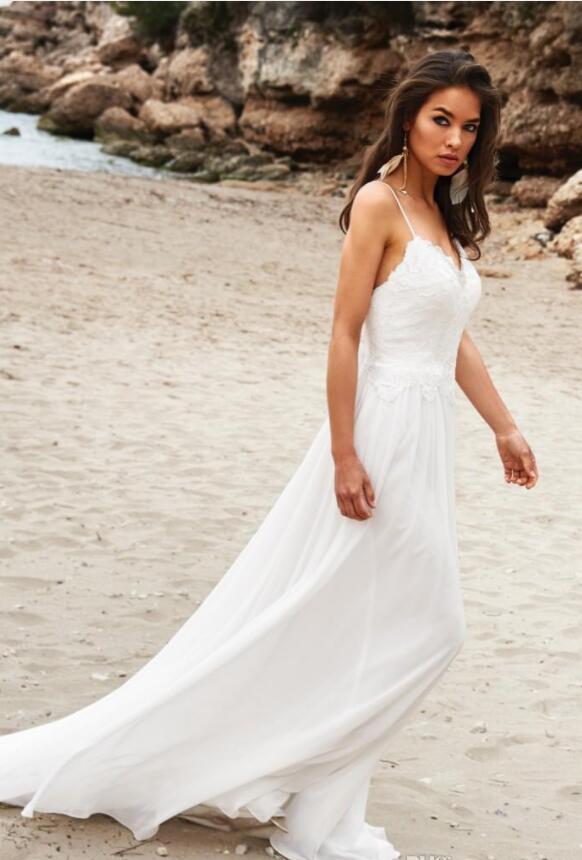 Simple A Line Wedding Dresses V Neck Sleeveless Backless Lace Applique Wedding Gowns Sweep Train