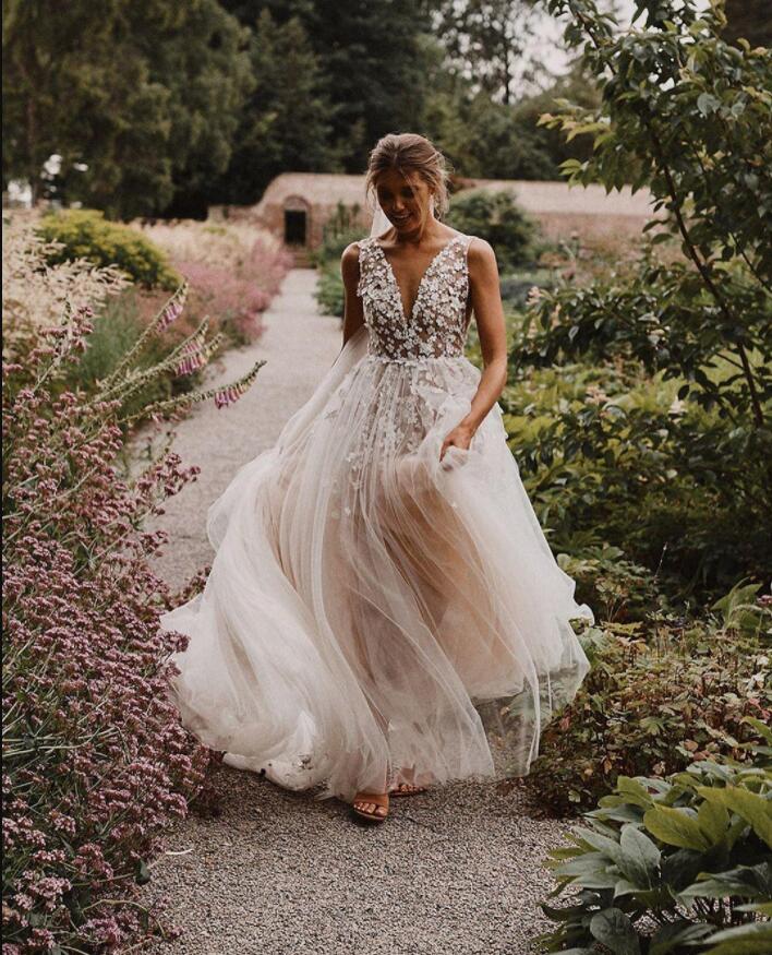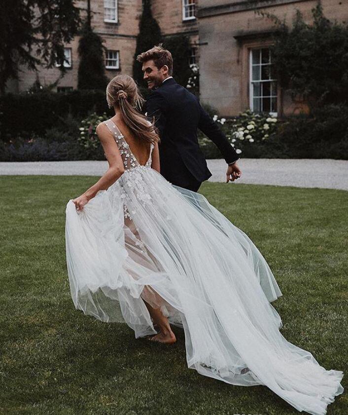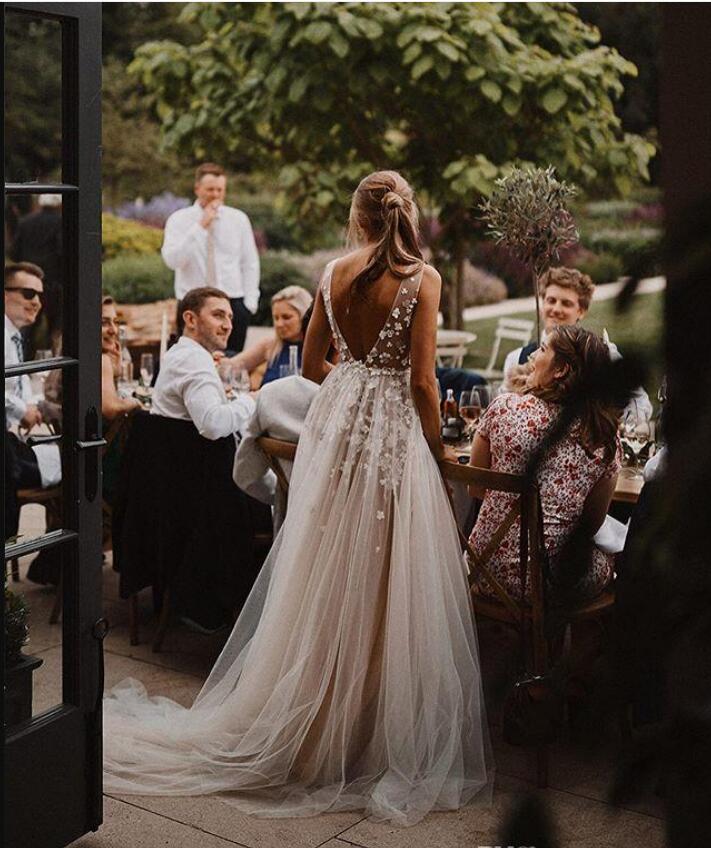 Bohemian New Arrival Sleeveless A Line Wedding Dresses Lace Tulle Appliques V Neck Bridal Gowns Backless Sweep Train Wedding Gowns