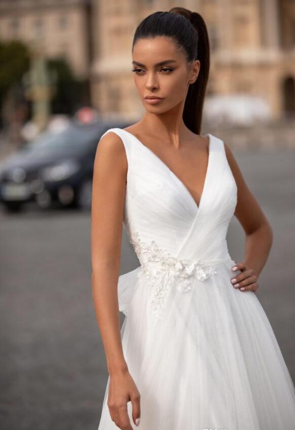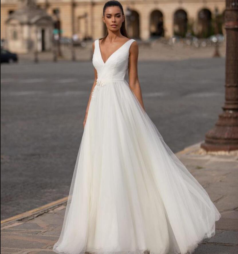 Simple A Line Wedding Dresses Sleeveless Spaghetti Tulle Lace Applique Wedding Gowns