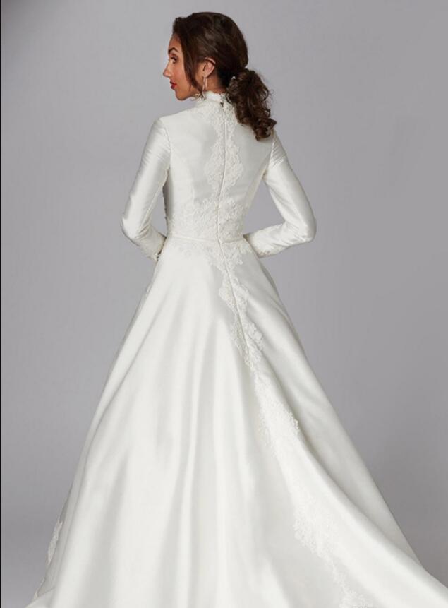 White A Line Dresses High Neck Long Sleeve Satin Applique Button Wedding Gown Sweep Train